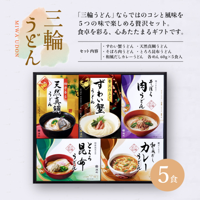 | 内容量 | ずわい蟹うどん×1、天然真鯛うどん×1、そぼろ肉うどん×1、和風だしカレーうどん×1、とろろ昆布うどん×1 |