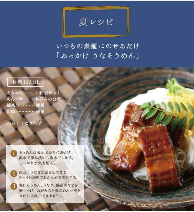 | 原材料 | そうめん:小麦粉(小麦(国産))、食塩、食用植物油 鰻の蒲焼き:二ホンウナギ(高知県産)、米発酵調味料、料理酒、糖類(上白糖、黒糖)、本みりん、合わせだし、発酵調味料(ごまを含む)、鰹節パウダー、唐辛子/増粘剤(加工でんぷん) 鰻の蒲焼き(ひつまぶし):二ホンウナギ(高知県産)、米発酵調味料、料理酒、糖類(上白糖、黒糖)、本みりん、合わせだし、発酵調味料(ごまを含む)、鰹節パウダー、唐辛子/増粘剤(加工でんぷん) |